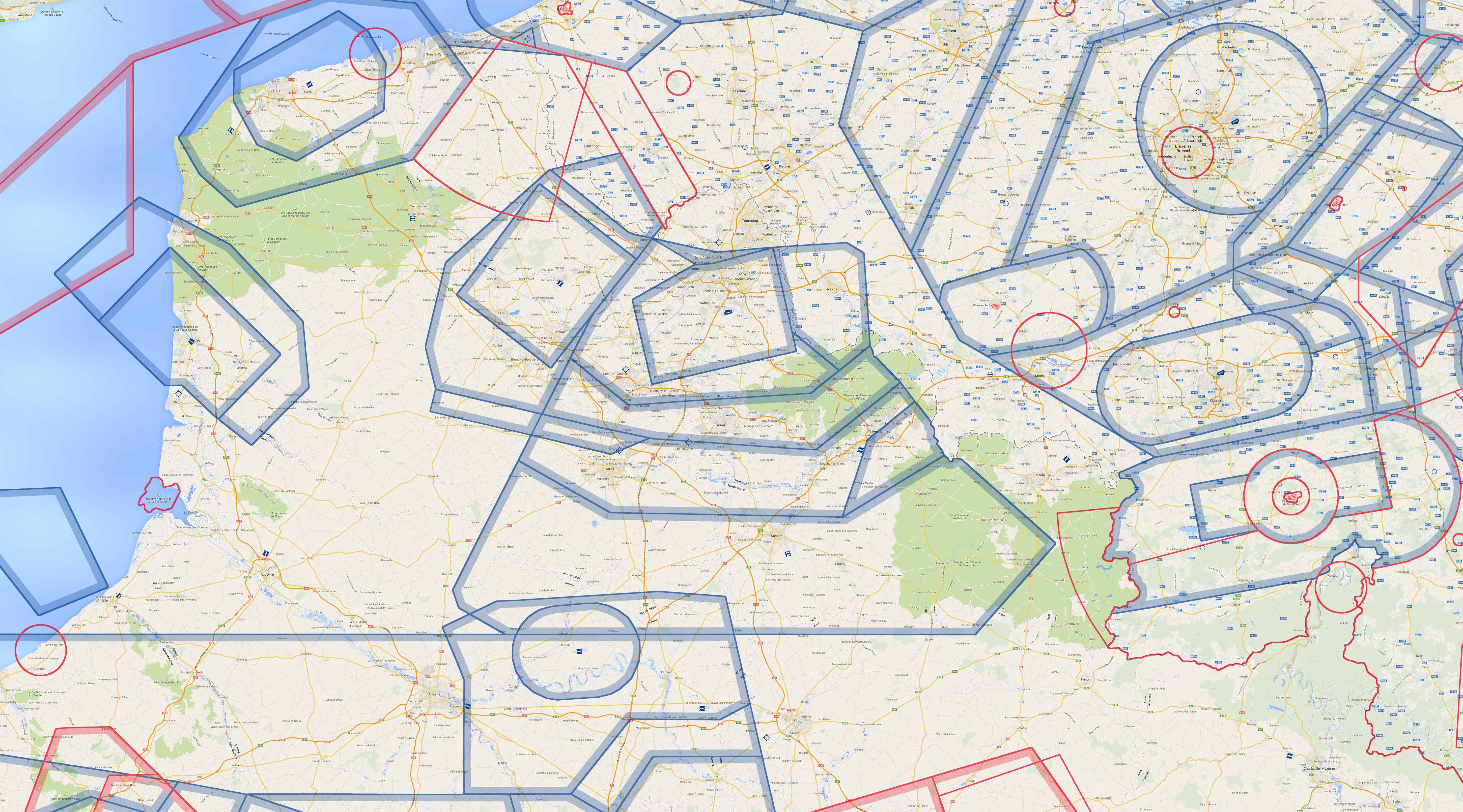 Les cartes embarquées dans l'application couvrent une zone de 440×160 km centrée sur le nord de la France (voir image ci-contre) et sont basées sur la carte OACI 2014. La carte complète est consultable sur ce lien.