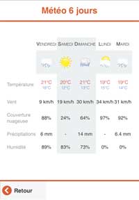 - Températures mini/maxi, force du vent, couverture nuageuse, précipitations, humidité.